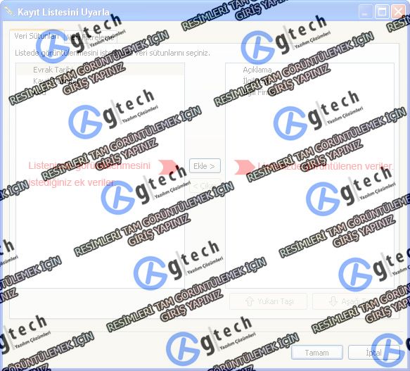 | Açılan " Kayıt Listesini Uyarla" ekranında bulunan " Veri Sütunları" sekmesinde listenizde görüntülenmesini istediğiniz verileri ekle butonuna basarak alanınıza ekledikten sonra "Tamam" butonuna tıklayarak kayıt edebilirsiniz. |